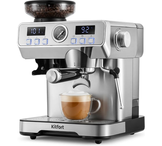 Кофейная станция КТ-7694 сочетает в себе два устройства в одном корпусе. Встроенная кофемолка с коническими жерновами из нержавеющей стали позволяет измельчать кофейные зерна непосредственно перед приготовлением кофе, что положительно отражается на вкусе готового напитка. С помощью стимера вы можете приготовить молочную пенку, а также подогреть паром остывший чай или другие напитки. Также можно включить подачу горячей воды через стимер. Кофейная станция поможет приготовить эспрессо, а также множество других видов кофе на ваш вкус.