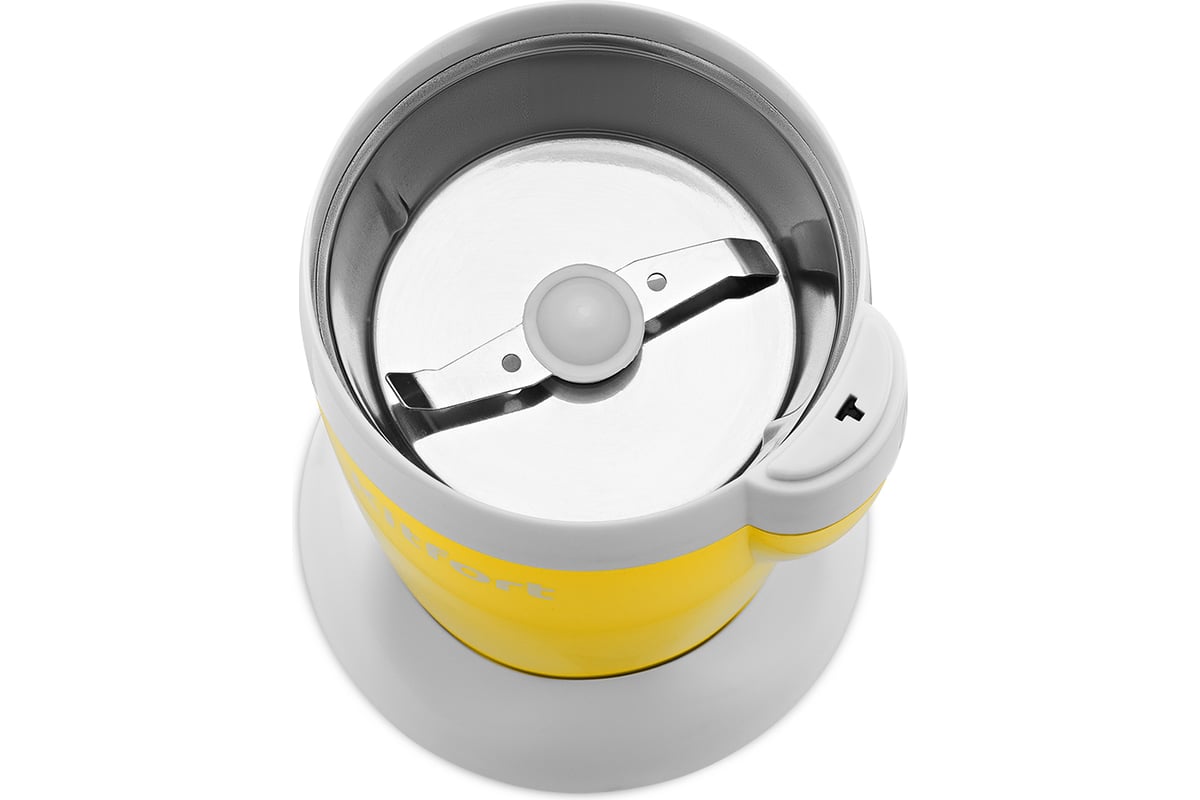 Кнопка включения расположена на крышке кофемолки. Пока вы нажимаете на кнопку включения, устройство работает. При отпускании помол прекратится. Защитный механизм не позволит включить кофемолку, если крышка установлена неправильно или не установлена.