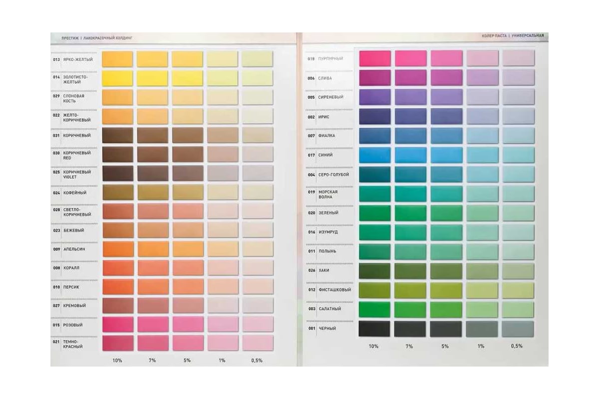 Для колеровки эмалей, красок, лаков и шпатлёвок всех типов: латексных и акриловых на водной основе, алкидных на органических растворителях, масляных на олифах и других лакокрасочных материалов, а также цементных составов, штукатурок, затирок для швов. Для наружных и внутренних работ.