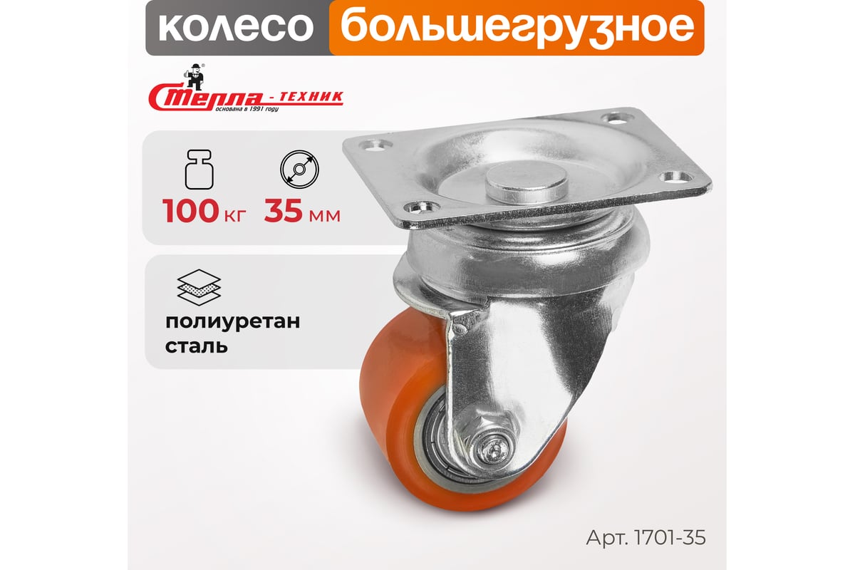 Колесо большегрузное поворотное, диаметр 35 мм, грузоподъемность 100 кг, полиуретан, сталь СТЕЛЛА-ТЕХНИК 1701-35