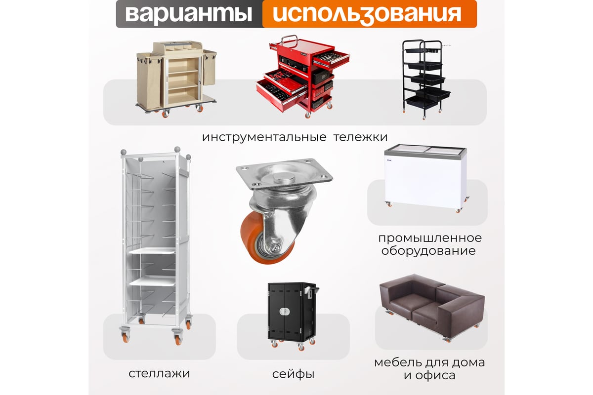 Все характеристикиКолесики для мебели промышленной диаметром 35 мм и грузоподъемностью 100 кг. Колесо большегрузное имеет стальной сердечник с полиуретановой шинкой жесткостью 93 шор А, высокая устойчивость к износу и сопротивляемости усилию на разрыв. В ступице колеса расположен шариковый подшипник. Аппаратные колеса применяются в случаях, когда необходимо бережное отношение к поверхности. Конструктивно они похожи на колеса для мебели, в исполнении с креплением имеют компактный кронштейн и небольшую площадку крепления, отличаются высокой грузоподъемностью Идеально подходят для использования в магазинах, общественных учреждениях, для медицинского оборудования и колеса для мебели в домашних условиях, в том числе на хрупких половых покрытиях. Примеры использования: тележки для супермаркетов, витрины, стенды в магазинах, инструментальные тележки, передвижная мебель офисная и домашняя мебель. Температурный режим эксплуатации от -20 до +80С.
