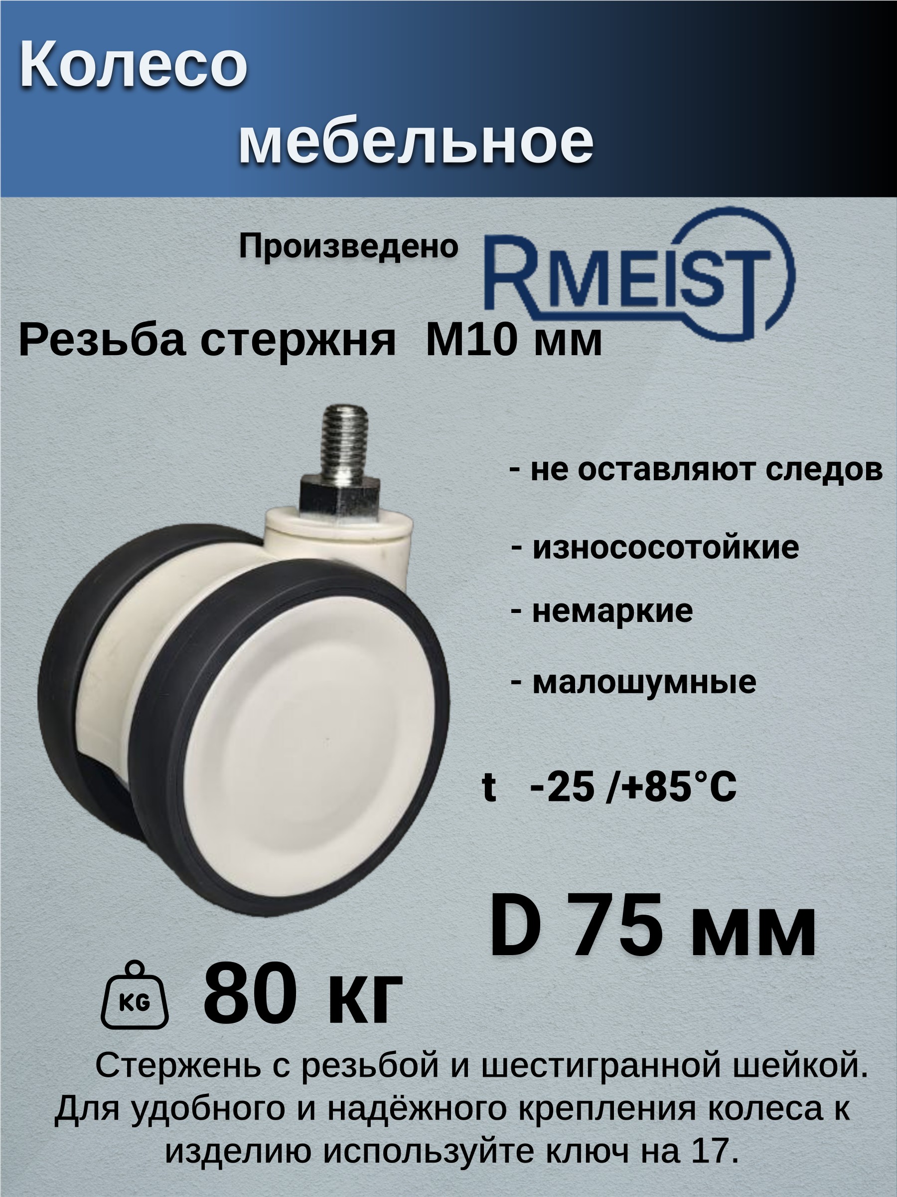 Колесо мебельное поворотное Rmeist IUL 075 PJP3 D12 75 мм, стержень с резьбой М10 мм, 1 шт. RM00000001ВИ