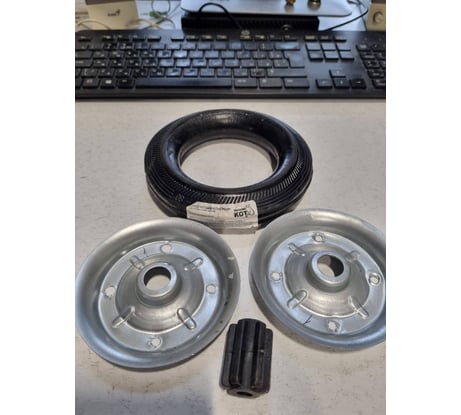 Пластиковая втулка на ось, ободок металический, далее сплошная резина.