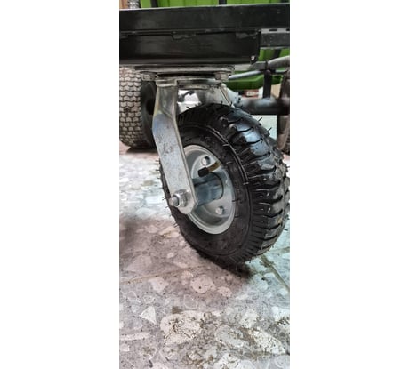 Слелано добротно, вилка из толстого металла. Покупал на замену штатному колесу тележки Greenworks, которое достало своим грозотом при движении по плитке и асфальту. Площадка встала на штатные места. Поменять только колесо не удастся, тыпица значительно шире штатного. Общая высота чуть больше, примерно 26см, под нагрузкой, ессно, разница меньше. Из-за этого изменился угол вращения вилки, что делает неохотным его поворот при смене направления движения. Но это мешает гораздо меньше, чем грохот штатного