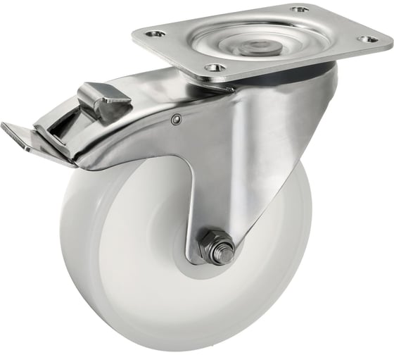 Колесо из полиамида поворотное твердостью 70 Шор D. Основание: монолитное полиамид 6. Поворотный кронштейн из нержавеющей стали оснащен двухрядным подшипником и тормозом.