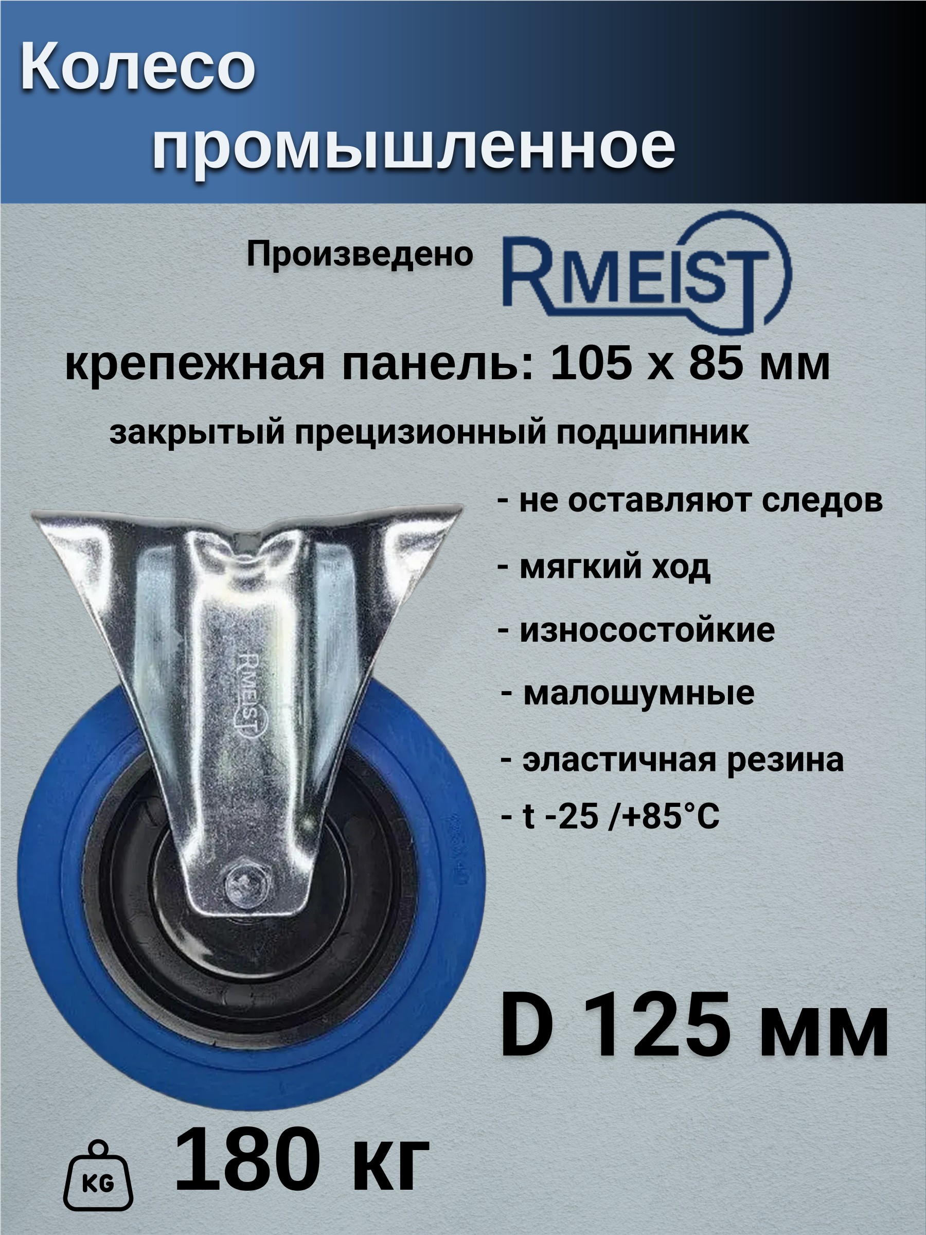 Колесо промышленное с синей термопластичной резиной неповоротное Rmeist IMS 125 PJP1 F62 blue 125 мм, крепежная панель P62-105x85 мм, 1 шт. RM00066349ВИ