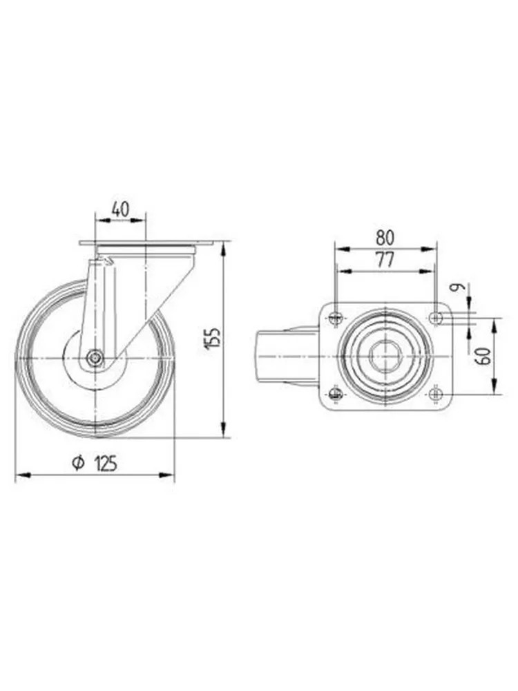 Колесная опора поворотная без тормоза, диаметр 125 мм.