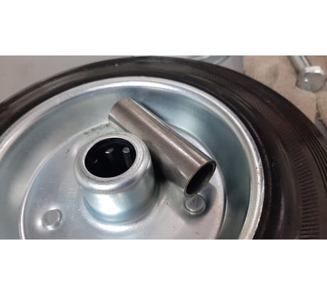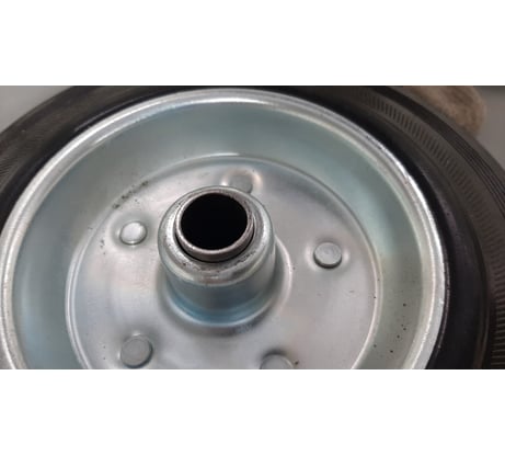 Хватило ровно на полтора года. У обоих колес протерлись оси, у одного почти лопнуло (на фото), у второго - вообще, раскрылось как тюльпан и заблокировало тележку. Пробег был порядка 150-200 км. Поменял на большегрузные полиуретановые, раз в год колеса менять то еще удовольствие.