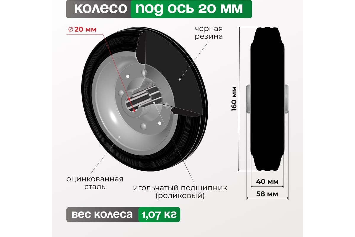 Изготовлено из черной стандартной резины, центр выполнен из двух оцинкованных дисков из штампованной стали. Ступица имеет игольчатый (роликовый) подшипник. Подходит для эксплуатации при температуре от -20 до +60С.
