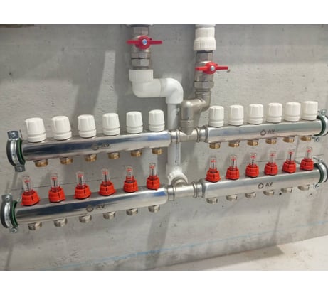 Коллектор AV Engineering 1/2х6 выходов, двухсторонний AVE155021 используется котлах, в системах отопления и водоснабжения, для смешения среды из разных параллельных веток или раздачи по ним.