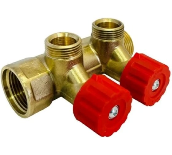 Коллектор латунный Апогей КЛА 2002.045-4У-ВГР(К)-15 DN20 ВР3/4- НР3/4 м/о 45 мм НР1/2''ЕК с регулирующими вентильными головками красными на 2 выхода 411009