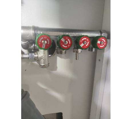 - Удобно и понятно: в ручки вентилей встроены информативные шильды, на которых цветом обозначается горячая/холодная вода и названия потребителей (сантехнических точек)