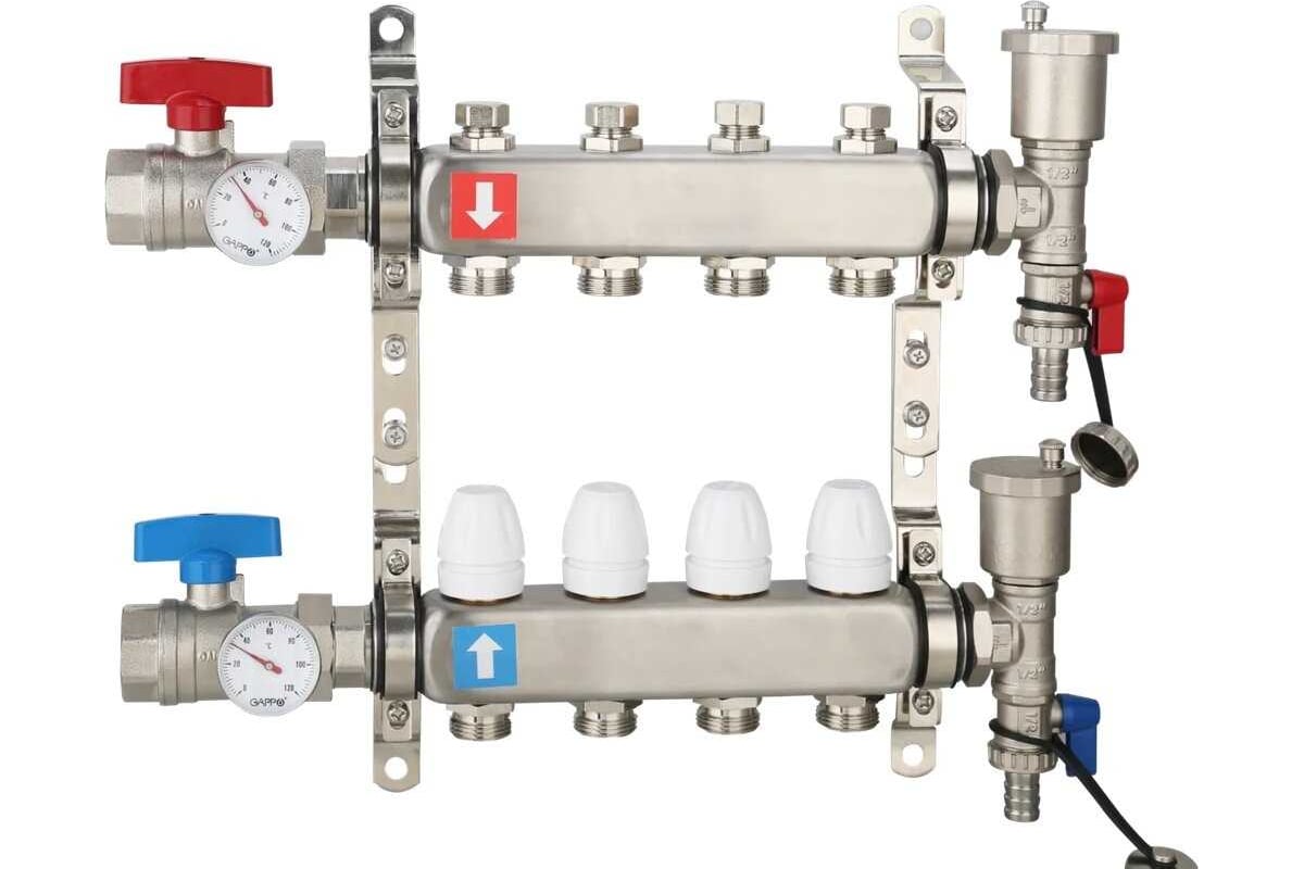 Коллектор регулируемый с запорными клапанами Gappo из нержавеющей стали, 2 шаровых крана с термометром, 2 воздухоотводчика, 2 сливных крана, 2 кронштейна, 2-вых. x 1" x 3/4" G426.2