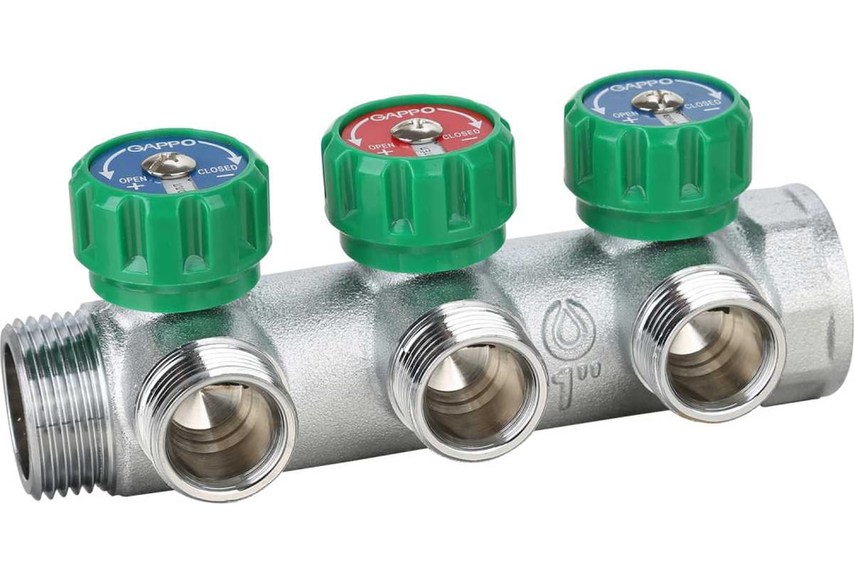 Коллектор регулирующий Gappo G1002.03, 1" ВР-НР, 3 выхода с евроконусом 3/4". Из латуни, устойчив к коррозии. Обеспечивает равномерное распределение теплоносителя.