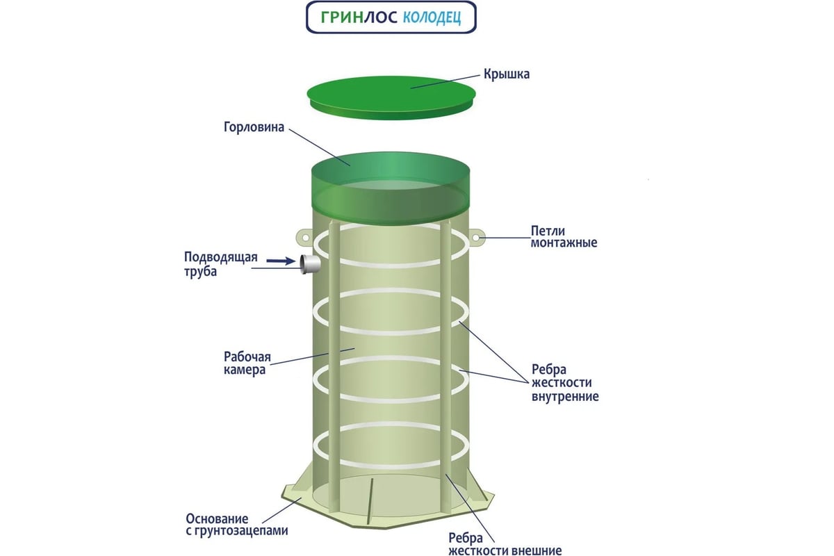 Колодец имеет герметичную пластиковую конструкцию с ребрами жесткости, основание с грунтозацепами и оснащен крышкой.