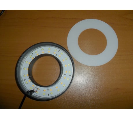 Две группы светодиодов - тёплые/холодные. С пульта включается одна из них или обе сразу. Яркость регулируется ШИМ-ом, ток ограничивается просто резисторами на плате светодиодов. Потребление по USB от 80 мА до 1,6 А в зависимости от режима и яркости. Кто будет использовать с микроскопом: внутренний диаметр кольца 48 мм, внешний 90 мм, толщина 14 мм. Кольцо металлическое. Штанги достаточно жёсткие и хорошо держат нагрузку.