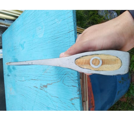Он кривой. Он кривой, Карл! Если смотреть "сверху" то отклонение лезвия влево примерно 10°. Рукоятка вся в непонятных помарках черной и синей краски, присутствуют вмятины.