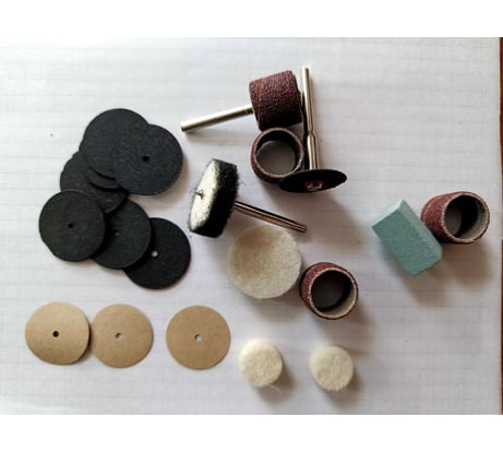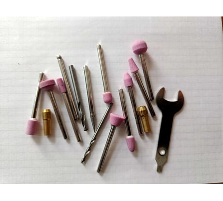 При получении главное, полагаю, установить факт работы, отсутствие дыма, скрежетов, пульсирующего свиста, дребезга и тому подобных явлений, пощелкать выключатель и покрутить регулятор скорости, проверить резьбы патронов и хоть как-то оценить уровень биения (вибрации) - наощупь, а также ставил центрированное сверло и смотрел ось на разных скоростях напросвет. Обороты по свидетельству бытового тахометра 13000-34500. То, что ожидается как осевое вращение (например, условно прямого сверла), на самом деле сильно зависит от цанги - чем короче губки, тем больше прецессия (ну надо же!), поставил - крутит конусы, перевтыкнул - нормально, через раз (вообще гуляющий внутри патрона хвостовик это ни разу не нормально, но так и на других граверах с таким патроном, увы и ах). Квадрата для штока вала в шпинделе здесь нет, как собственно и в других бюджетных моделях (уже давал описание на два бюджетных комплекта: код товара 16348380 и 28019636). В целом эта модель по-лучше, но и по-дороже. Вес с проводом 677гр, вес без провода примерно 545гр. Вибрация есть и это ни разу не прикольно (может в граверах так задумано?). Вонючесть имеет место прежде всего от кейса и чуть меньше пахнет провод. Мощность в понимании падения оборотов при нагрузке - ну да, ощущается падение, особенно на низких оборотах. Искрение на щетках не наблюдается, громкость визга сравнительно низкая при умеренно мягкой мелодичности. В инструкции заявлено: Звуковое давление - 73+3dB(A), Акустическая мощность - 84+3dB(A), Величина вибрации - 3.74+1.5m/s2. Перед покупкой изучил предложения более десяти комплектов и по сей день не вижу инструмента, который мог бы рекомендовать для постоянной работы. Качество зависит от экземпляра к экземпляру. По оснастке: 0. Кейс опломбирован (пломба сама по себе не разрывается) и ручки стянуты хамутом. 1. Оснастка соответствует описанию. 2. Сверла две штуки под цанги, кривоваты, заточка на четверочку. 3. Цанги всего 2 шт - латунные, 3.2, 2.4мм. 4. Допонительные щетки не прилагаются - большой минус комплектации. 5. Документация в виде инструкции по эксплуатации есть, нормальная - упоминаются основные насадки с указанием материалов и скоростей, а также дана схема конструктива устройства. 6. Оправка мягко говоря неидеальной центровки. Вообще, оправки это очень грустная история - у меня из теперь уже десяти оправок разных наборов только две неидеальной, но вменяемой центровки. Если с камнями это в разумных пределах можно нивелировать, то на отрезных дисках это особо важно. Посадочное основание оправки (крепления) можно поправить: ставите в шуруповерт с центрированным патроном и на малых оборотах шлифуете бруском для заточки ножей - получится поверхность не совсем плоская, зато перпендикулярная оси вращения. Вобщем погрешности гравера, цангового вкладыша, оправки и диска совокупляются в итоговую вибрацию.