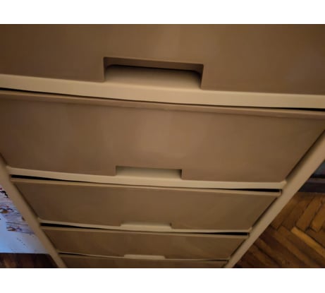 Странное "конструкторское решение: 1. лицевой фасад сделан выпуклым, НО ящики прямоугольные, как следствие углы ящиков выпирают. 2. опоры имеют ролики, позволяющие передвигать комод, НО конструкторское решение предусматривает крепление к стене - в комплекте даже есть для этого хомуты и шурупы.