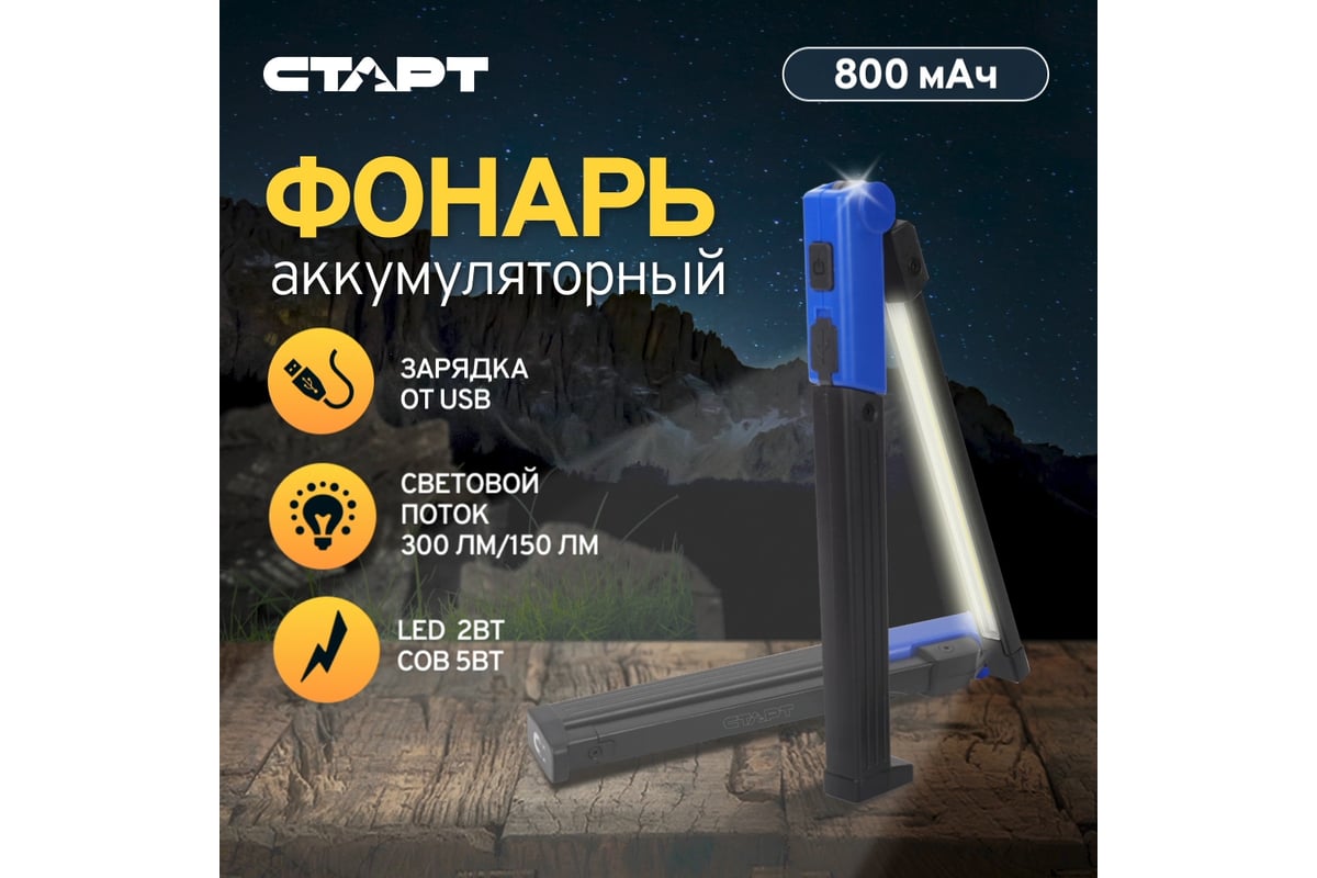 Фонарь СТАРТ имеет функцию переключения между тремя режимами работы, что предполагает гибкость использования в различных ситуациях. Устройство оснащено источником света, объединяющим мощности 5 Вт сверхяркого светодиода (СОВ) и 2 Вт LED. Это обеспечивает световой поток в 300 Лм для направленного света и 150 Лм для рассеянного света. Фонарь способен создавать луч света на расстоянии до 20 метров, что делает его отличным помощником в походе, при ремонтных работах и в других ситуациях.