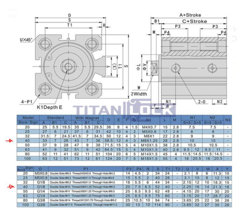 Компактный пневмоцилиндр TITAN LOCK серии SDA 40x50 TLP-PC40X50SDA