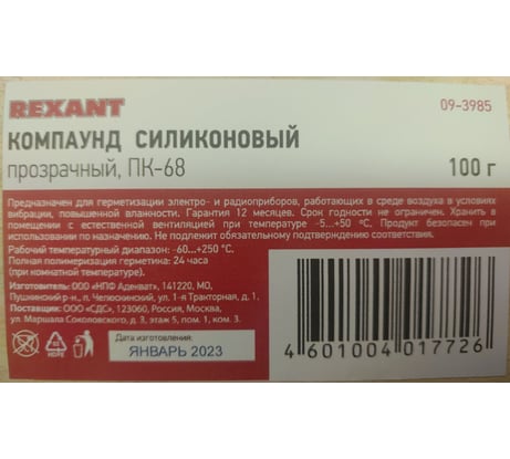 Компаунд силиконовый, прозрачный ПК-68 (двухкомпонентный) 100 гр REXANT предназначен для герметизации электро- и радиоприборов, работающих в среде воздуха в условиях вибрации, повышенной влажности в температурном интервале –60...+250°C.