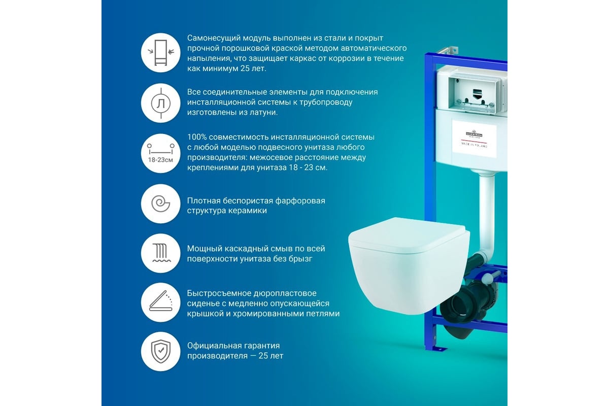 - Гладкая поверхность унитаза, способствует легкой чистке.
