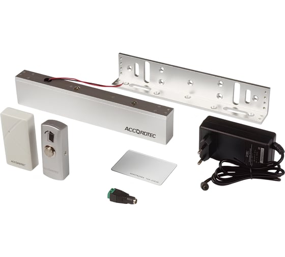 Это универсальное решение объединяет электромагнитный замок, считыватель со встроенным контроллером, источник питания, кнопку выхода и комплект бесконтактных карт доступа.