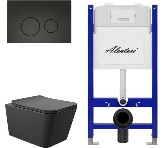 Комплект ALENTORI Инсталляция для унитаза SISTEMA 50 AL.SIS33T клавиша CHIAVE L, черный мат AL.CHI103BM + Унитаз Long 520х370 безободковый, Vortex (Торнадо), Soft-Close, черный мат, квадрат AL.SIS33TAL.CHI103BMQV2140