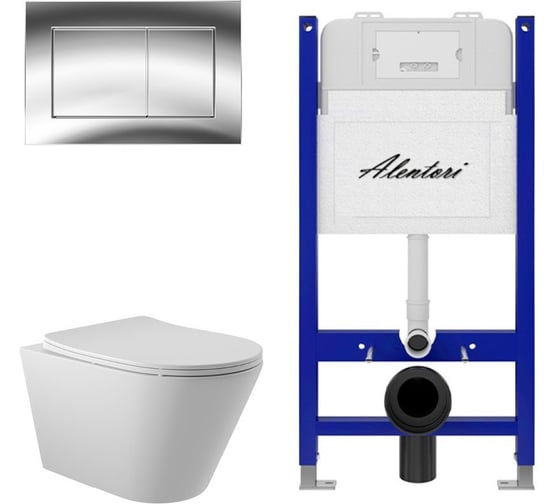 Комплект ALENTORI Инсталляция для унитаза SISTEMA 50 AL.SIS33T с клавишей CHIAVE A, хром глянец AL.CHI012CH + Унитаз Long 525х360 безободковый, Vortex (Торнадо), Soft-Close, белый мат, конус AL.SIS33TAL.CHI012CHCV2120