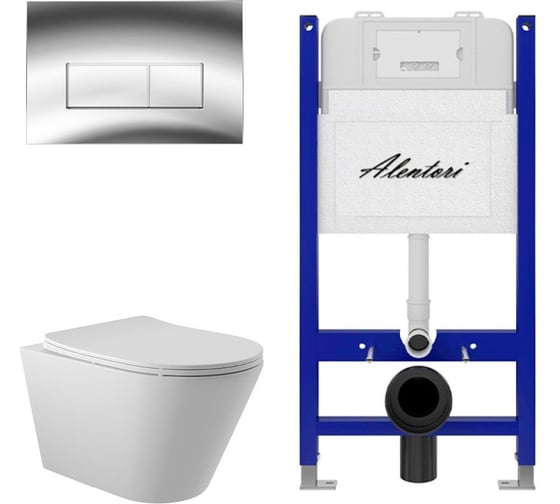 Комплект ALENTORI Инсталляция для унитаза SISTEMA 50 AL.SIS33T с клавишей CHIAVE H, хром глянец AL.CHI202CH + Унитаз Long 525х360 безободковый, Vortex (Торнадо), Soft-Close, белый мат, конус AL.SIS33TAL.CHI202CHCV2120