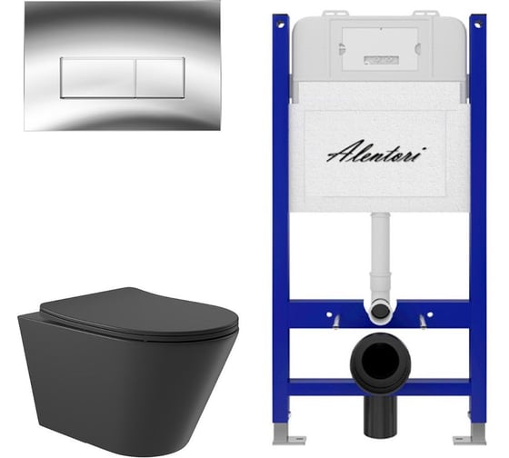 Комплект ALENTORI Инсталляция для унитаза SISTEMA 50 AL.SIS33T с клавишей CHIAVE H, хром глянец AL.CHI202CH + Унитаз Long 525х360 безободковый, Vortex (Торнадо), Soft-Close, черный мат, конус AL.SIS33TAL.CHI202CHCV2140