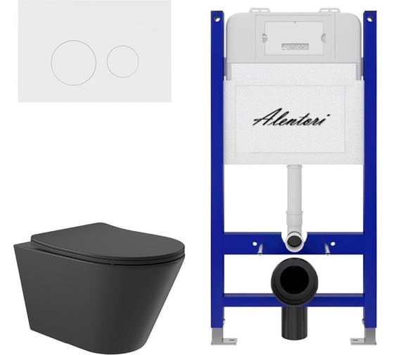 Комплект ALENTORI Инсталляция для унитаза SISTEMA 50 AL.SIS33T с клавишей CHIAVE L, белый мат AL.CHI019WM + Унитаз Long 525х360 безободковый, Vortex (Торнадо), Soft-Close, черный мат, конус AL.SIS33TAL.CHI019WMCV2140