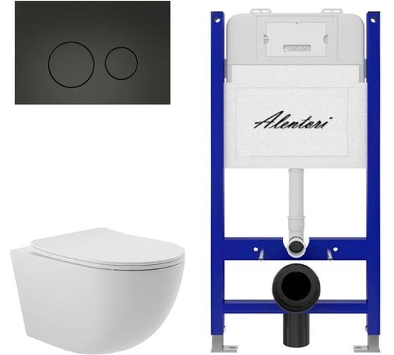 Комплект ALENTORI Инсталляция для унитаза SISTEMA 50 AL.SIS33T с клавишей CHIAVE L, черный мат AL.CHI103BM + Унитаз Long 525х360 безободковый, Vortex (Торнадо), Soft-Close, белый мат, овал AL.SIS33TAL.CHI103BMOV2120
