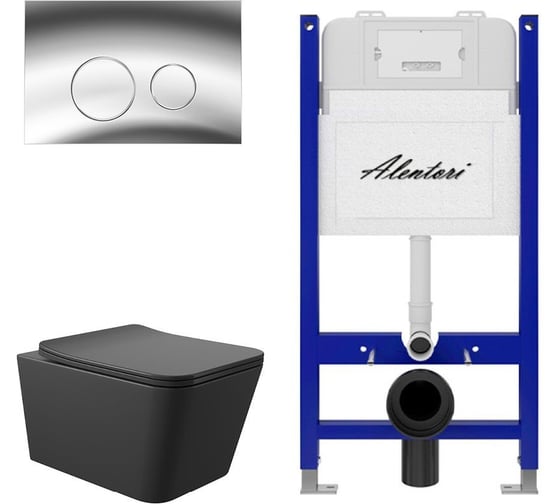 Комплект ALENTORI Инсталляция для унитаза SISTEMA 50 AL.SIS33T с клавишей CHIAVE L, хром глян AL.CHI102CH + Унитаз Long 520х370 безободковый, Vortex (Торнадо), Soft-Close, черный мат, квадрат AL.SIS33TAL.CHI102CHQV2140