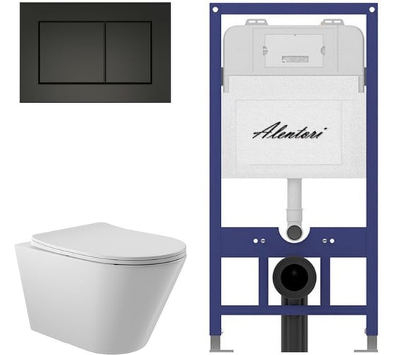 Комплект ALENTORI Инсталляция для унитаза SISTEMA 52 AL.SIS11T с клавишей CHIAVE A, черный мат AL.CHI013BM + Унитаз Long 525х360 безободковый, Vortex (Торнадо), Soft-Close, белый глян, конус AL.SIS11TAL.CHI013BMCV2110