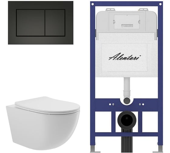 Комплект ALENTORI Инсталляция для унитаза SISTEMA 52 AL.SIS11T с клавишей CHIAVE A, черный мат AL.CHI013BM + Унитаз Long 525х360 безободковый, Vortex (Торнадо), Soft-Close, белый глян, овал AL.SIS11TAL.CHI013BMOV2110