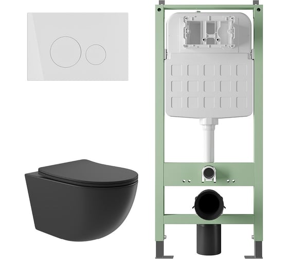 Комплект ALENTORI Инсталляция SISTEMA, панель смыва с круглыми кнопками, белый матовый + Унитаз подвесной Long 525х360 безободковый, Vortex (Торнадо), сиденье с микролифтом, черный матовый, форма овал ALS.SIS1101.WHOV2140