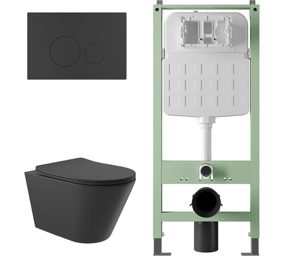 Комплект ALENTORI Инсталляция SISTEMA, панель смыва с круглыми кнопками, черный матовый + Унитаз подвесной Long 525х360 безободковый, Vortex (Торнадо), Soft-Close, черный матовый, форма конус ALS.SIS1101.MBCV2140