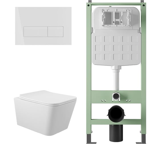 Комплект ALENTORI Инсталляция SISTEMA, панель смыва с прямоугольными кнопками, белый матовый + Унитаз подвесной Long 520х370 безободковый, Vortex (Торнадо), Soft-Close, белый матовый, форма квадрат ALS.SIS1102.WHQV2120
