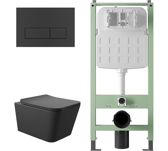 Комплект ALENTORI Инсталляция SISTEMA, панель смыва с прямоугольными кнопками, черный матовый + Унитаз подвесной Long 520х370 безободковый, Vortex (Торнадо), Soft-Close, черный матовый, форма квадрат ALS.SIS1102.MBQV2140