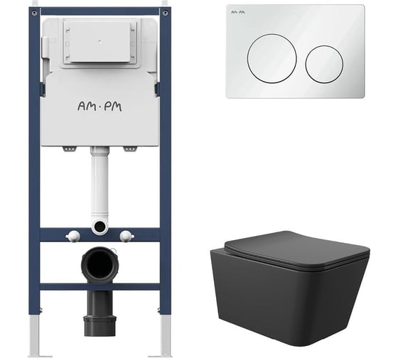 Комплект AM.PM I012709.0101 PrimeFit инсталляция для унитаза с клавишей PrimeFit L, бел глянц + Унитаз Long 520х370 безободковый, Vortex (Торнадо), сиденье Soft-Close, черный матовый, квадрат I012709.0101QV2140