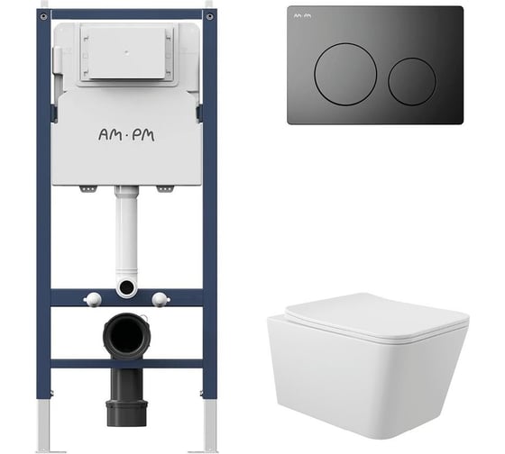 Комплект AM.PM I012709.0138 PrimeFit инсталляция для унитаза с клавишей PrimeFit L, черный матовый + Унитаз Long 520х370 безободковый, Vortex (Торнадо), сиденье Soft-Close, белый матовый, квадрат I012709.0138QV2120
