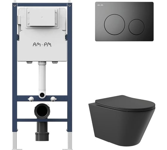Комплект AM.PM I012709.0138 PrimeFit инсталляция для унитаза с клавишей PrimeFit L, черный матовый + Унитаз Long 525х360 безободковый, Vortex (Торнадо), сиденье Soft-Close, черный матовый, конус I012709.0138CV2140