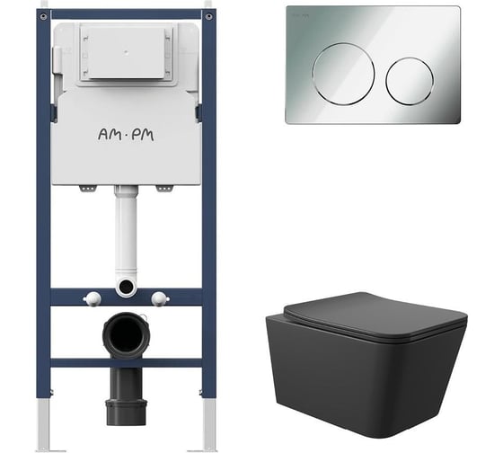 Комплект AM.PM I012709.0151 PrimeFit инсталляция для унитаза с клавишей PrimeFit L, хром глянц + Унитаз Long 520х370 безободковый, Vortex (Торнадо), сиденье Soft-Close, черный матовый, квадрат I012709.0151QV2140