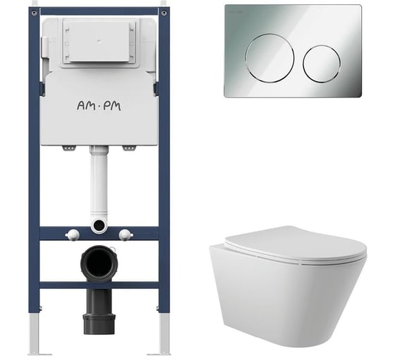 Комплект AM.PM I012709.0151 PrimeFit инсталляция для унитаза с клавишей PrimeFit L, хром глянц + Унитаз Long 525х360 безободковый, Vortex (Торнадо), сиденье Soft-Close, белый матовый, конус I012709.0151CV2120