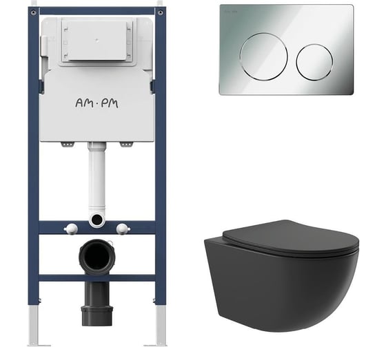 Комплект AM.PM I012709.0151 PrimeFit инсталляция для унитаза с клавишей PrimeFit L, хром глянц + Унитаз Long 525х360 безободковый, Vortex (Торнадо), сиденье Soft-Close, черный матовый, овал I012709.0151OV2140