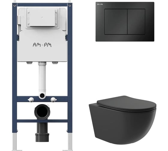 Комплект AM.PM I012709.0238 PrimeFit инсталляция для унитаза с клавишей PrimeFit S, черный матовый + унитаз Long 525х360 безободковый, Vortex (Торнадо), сиденье Soft-Close, черный матовый, овал I012709.0238OV2140