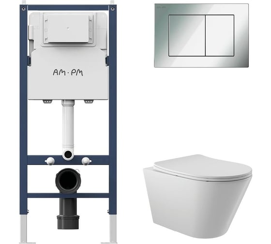 Комплект AM.PM I012709.0251 PrimeFit инсталляция для унитаза с клавишей PrimeFit S, хром глянц + унитаз Long 525х360 безободковый, Vortex (Торнадо), сиденье Soft-Close, белый глянцевый, конус I012709.0251CV2110