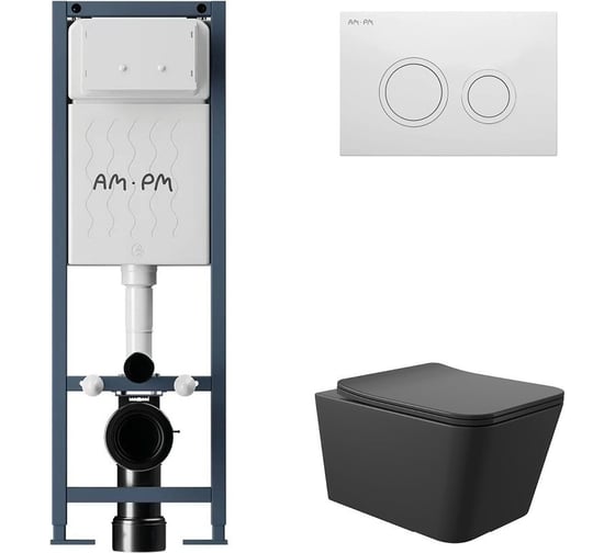 Комплект AM.PM I012711.0101 ErgoFit инсталляция для унитаза с клавишей ErgoFit L пластик, белый глянцевый + унитаз Long 520х370 безободковый, Vortex (Торнадо), Soft-Close, черный матовый, квадрат I012711.0101QV2140